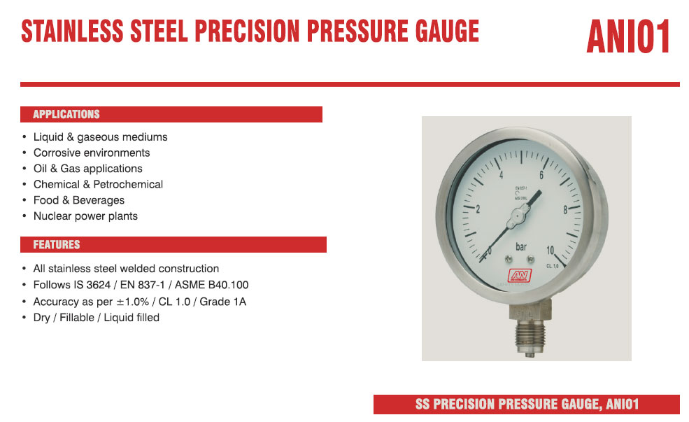 The Model I02-01 is a high-performance, all stainless steel pressure gauge engineered for demanding industrial applications requiring reliability, durability, and precise pressure measurement. Constructed entirely from corrosion-resistant materials, this gauge is suitable for use in harsh environments such as chemical processing, petrochemical plants, food and beverage industries, pharmaceuticals, and power generation.